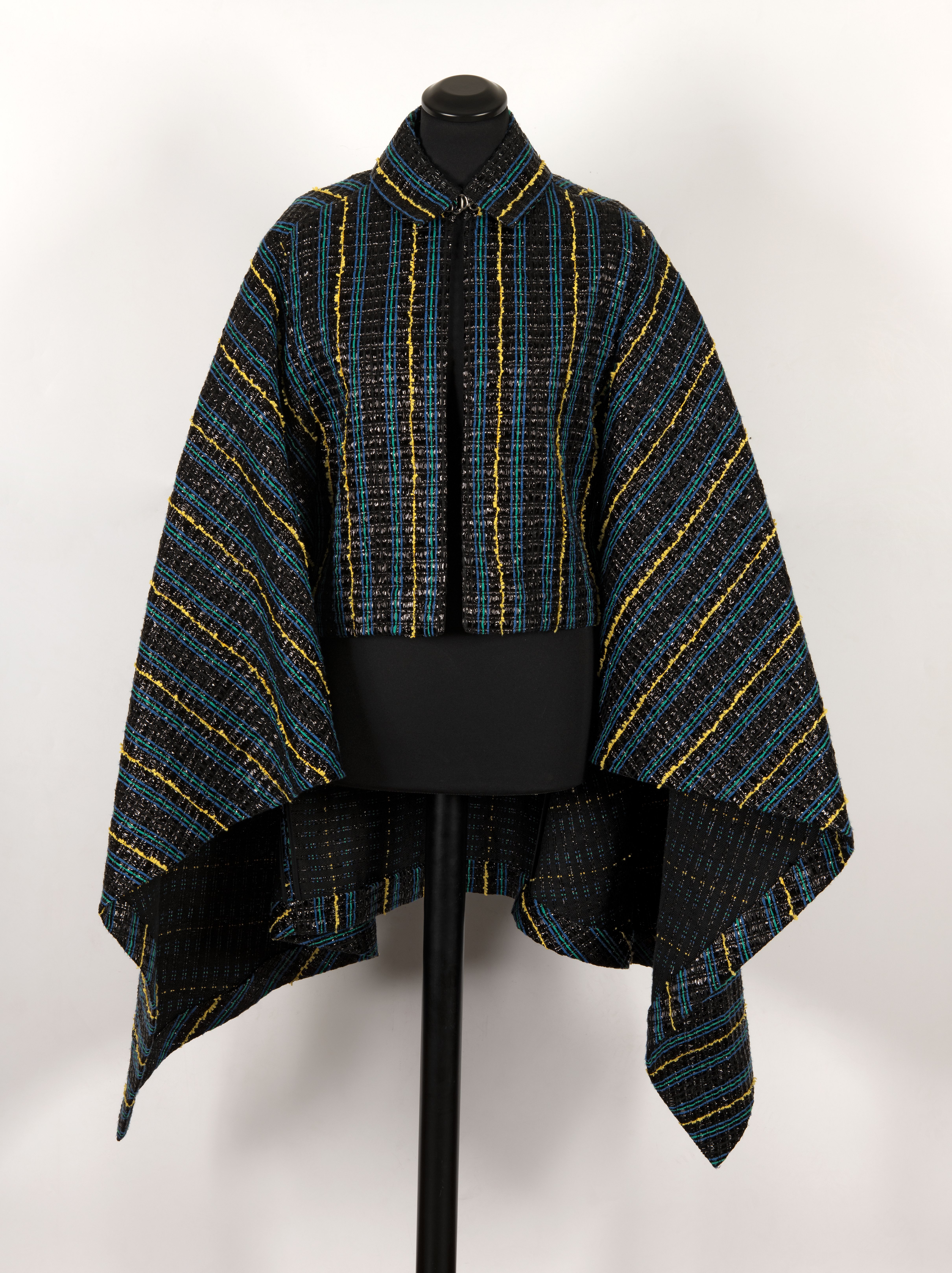 Cape by fashion designer Benjamin Benmoyal, woven from tape from VHS video tapes and cassette tapes and material from deadstock (unsold clothes) of fashion houses. Purchased in 2022. R-5074