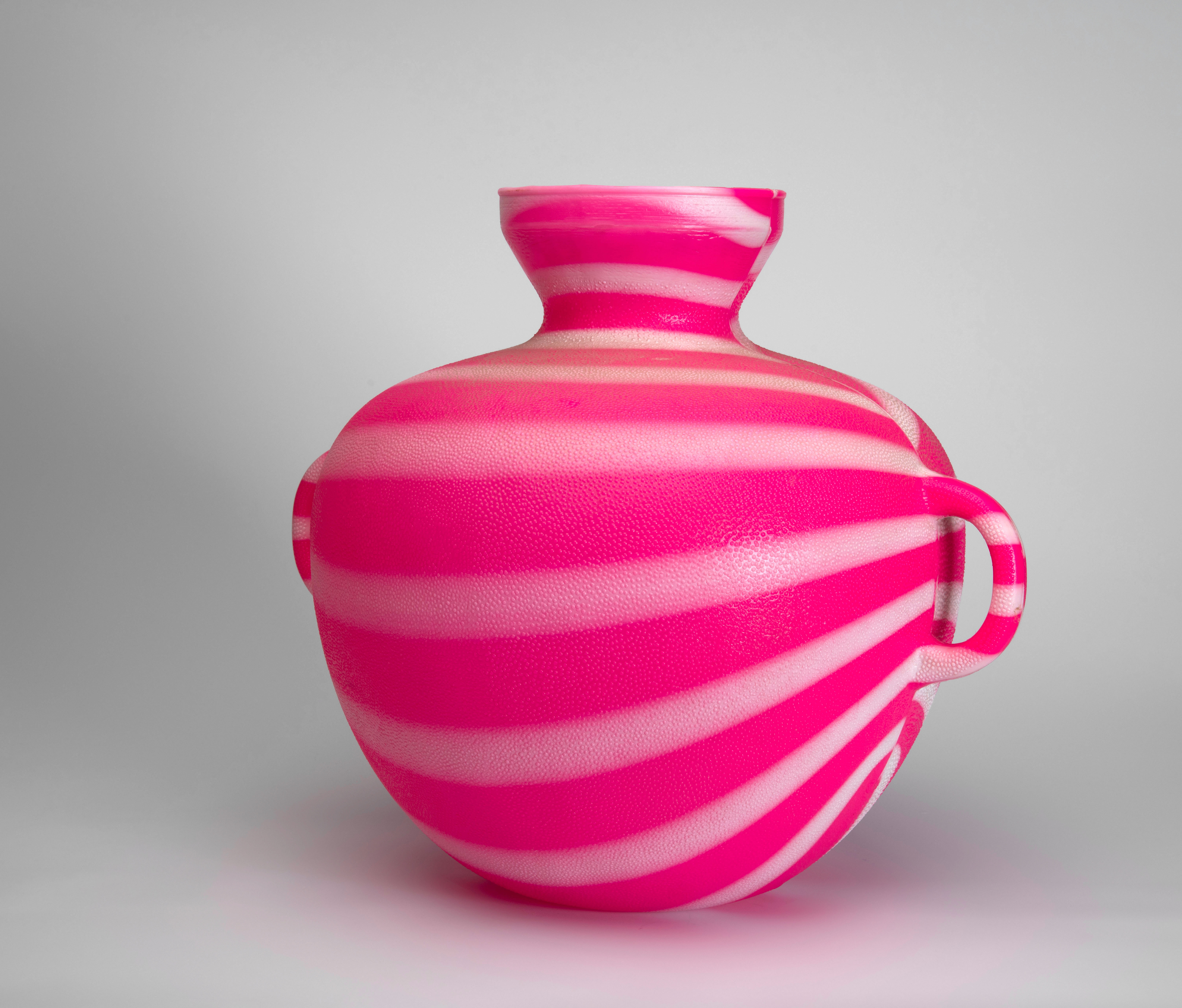 Brightly coloured plastic waterjar, produced locally in Guatemala in the 1980s. Based on cántaros, a local ceramic form of water holder. RV-5072-110