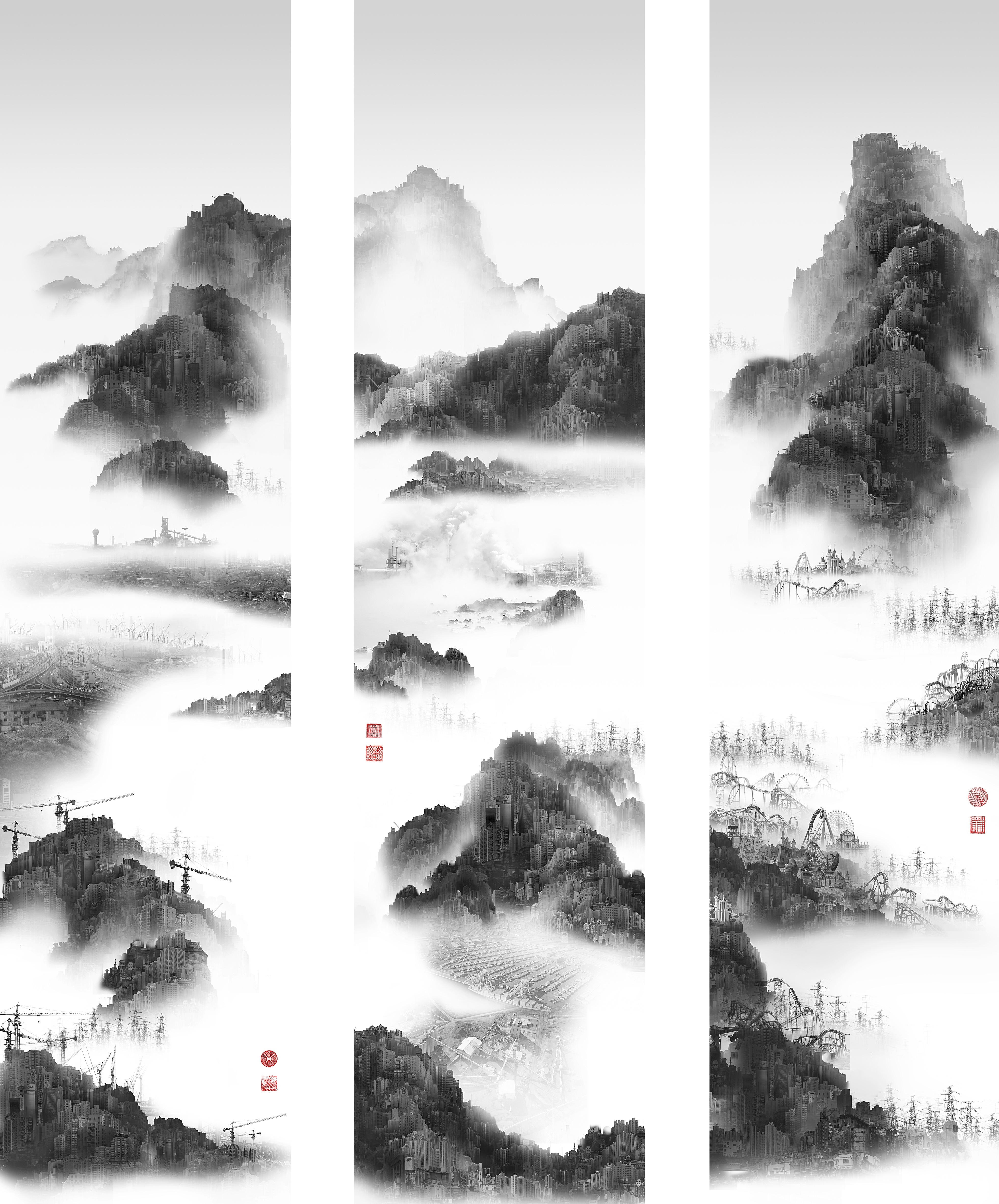 Phantom Landscape III - Triptych, China 2007 © Yang Yongliang, Collectie Wereldmuseum_7289-1, aankoop met steun van Vereniging Rembrandt