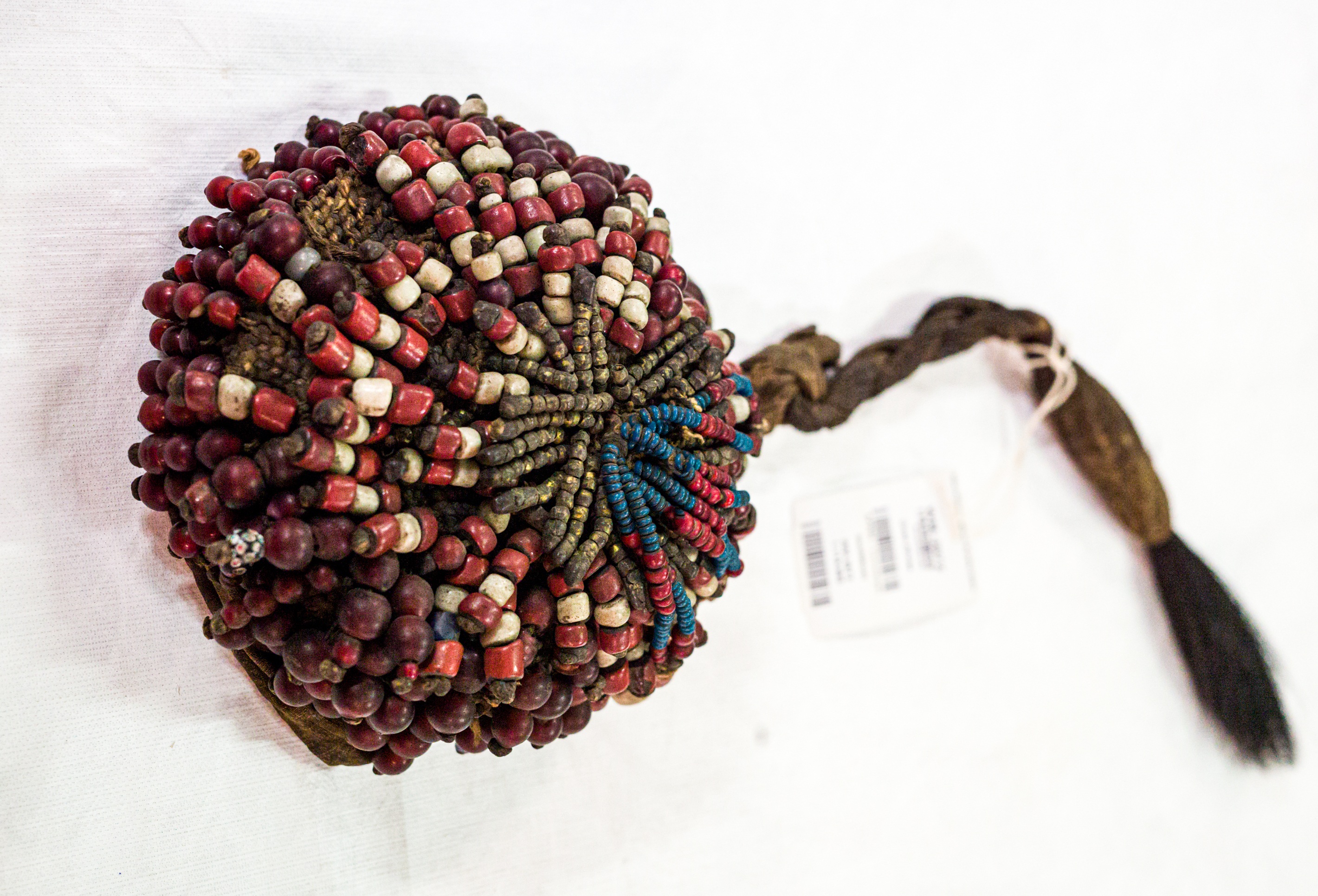 Hoofdtooi, Mozambique of Malawi, Massingire; voor 1884; textiel, kralen, kaurischelp, plantenvezel, dierenhaar; WM-2972