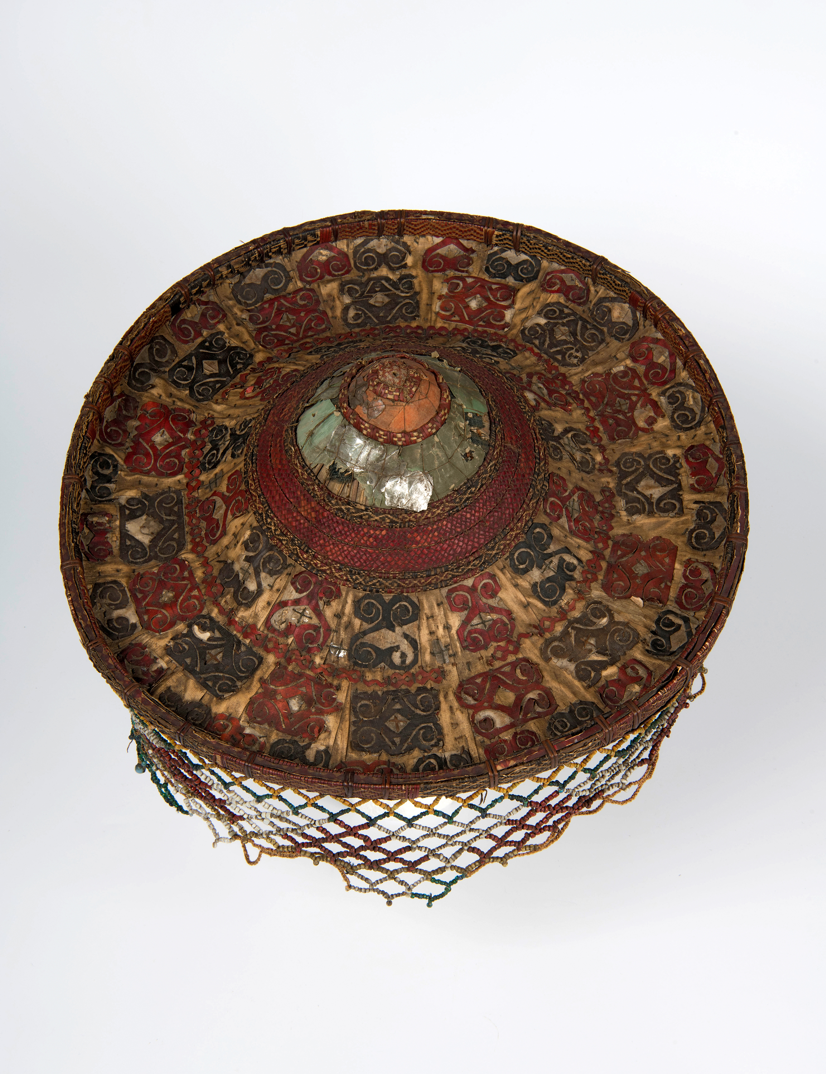 Priesterhoed – Tindung; rotan, mica, katoen, kralen; Sulawesi; voor 1884. Collectie Stichting Nationaal Museum van Wereldculturen