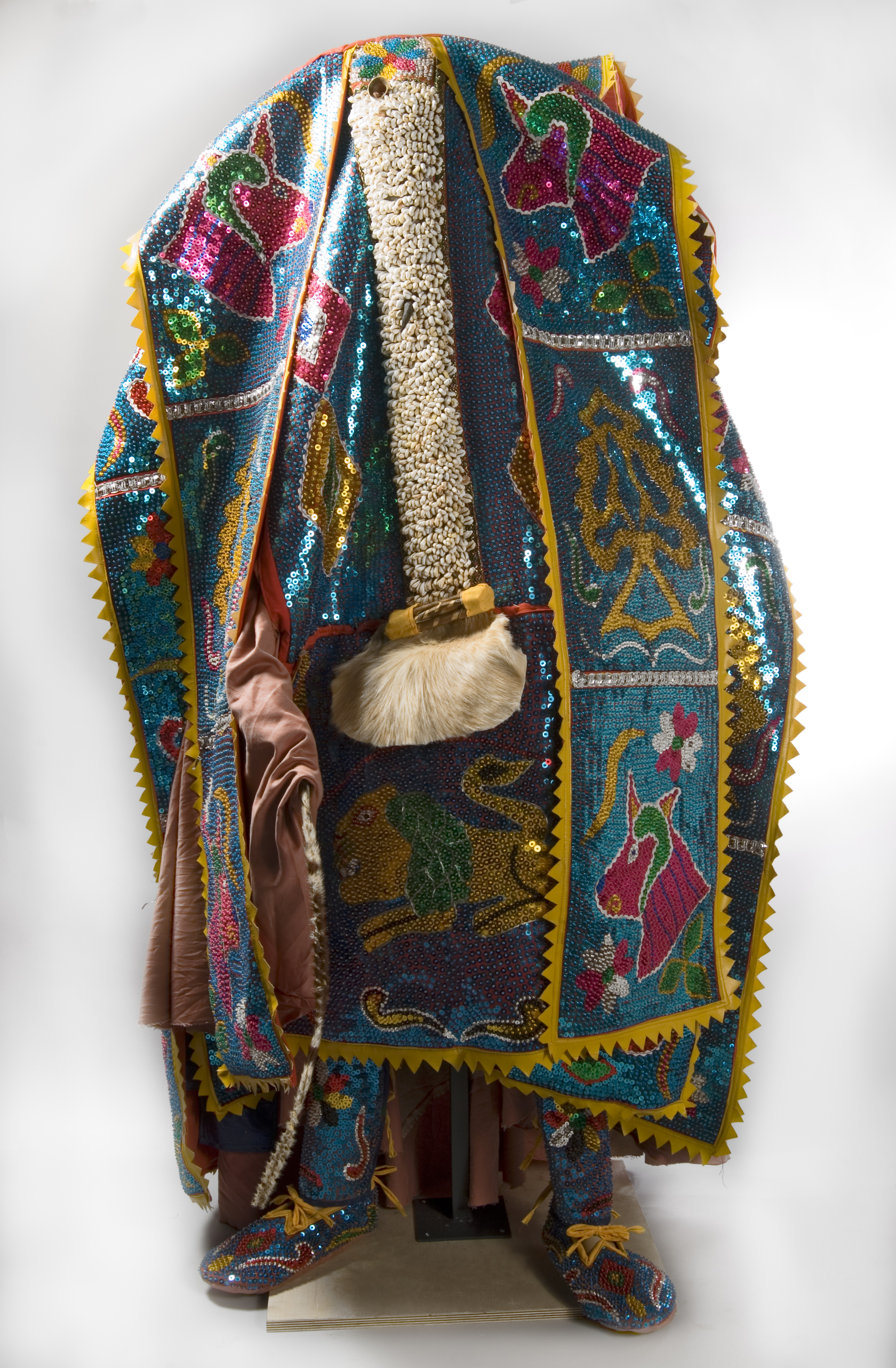 Egungun bovenkostuum met masker; pailletten, schelpen, katoen, huid (dierlijk); Benin; 2005. Collectie Stichting Nationaal Museum van Wereldculturen